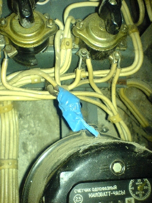 Пришли, сделали, НО КАК СДЕЛАЛИ! Просто отломили обгоревшую клемму рубильника, на которой искрили провода и скрутили эти провода, намотав на них изоленту!
